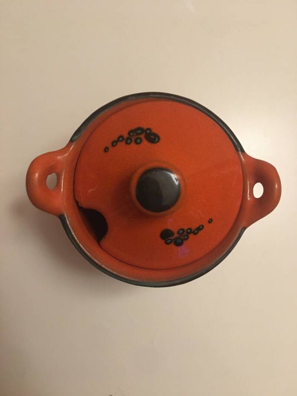 Deze oranje, met de hand beschilderde suikerpot is een must have voor iedere vintage fanatic, de unieke afbeelding van een zeepaard maakt het een unieke eyecather voor op tafel.